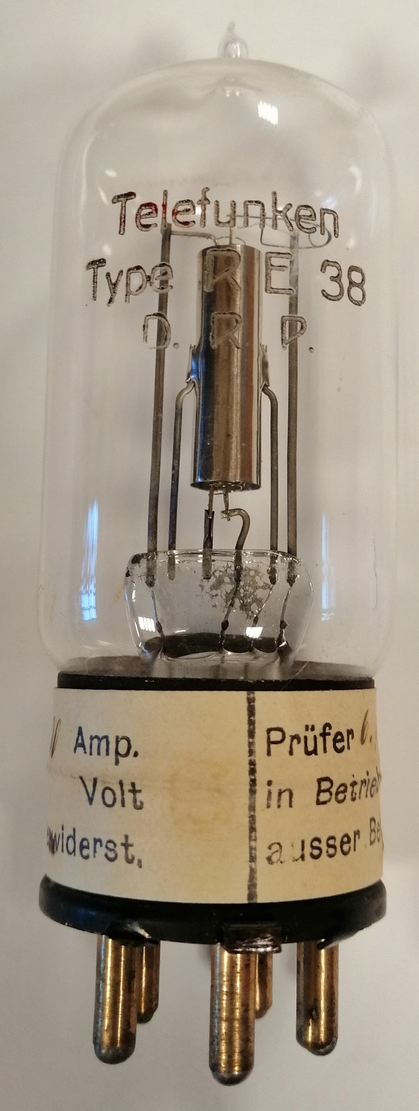 Žarilna nitka v triodi RE 38 je iz wolframa, ogrevana je bila z napetostjo 4 V pri toku 0,55 A. Delovala je pri anodni napetosti 40–70 V in imela strmino karakteristike 0,25 mA/V.