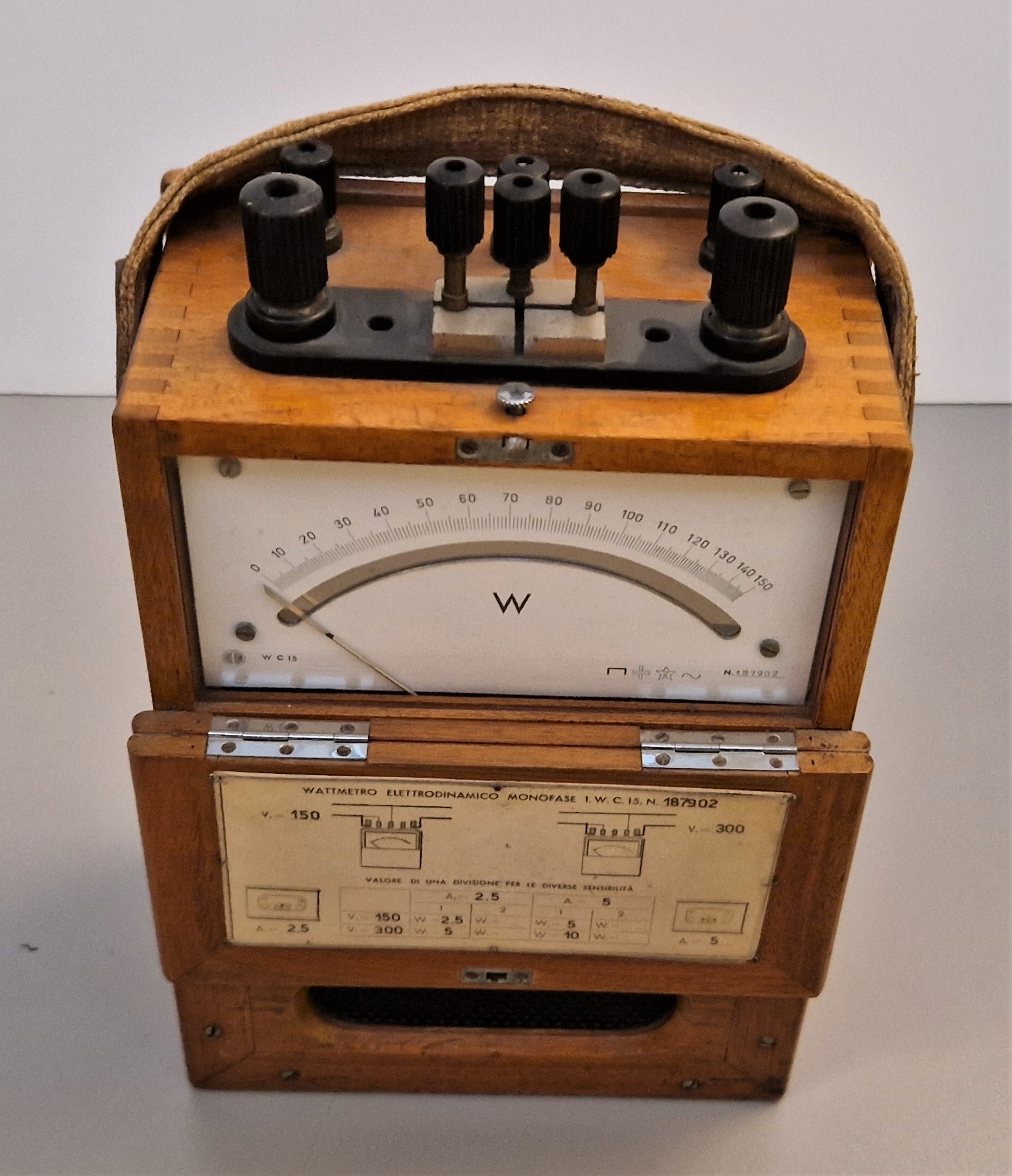 Vatmeter ima tokovno tuljavico sestavljeno iz dveh delnih tuljavic, ki ju lahko s pomočjo čepov vežemo zaporedno ali vzporedno, torej dve tokovni območji 2,5 A in 5 A. Napetostni območji pa sta 150 V in 300 V, kar dosežemo z dvema preduporoma. Razred točnosti r = 1,5, frekvenca 50 Hz, ničlišče naravnamo z vijakom, lega pa je ležeča.