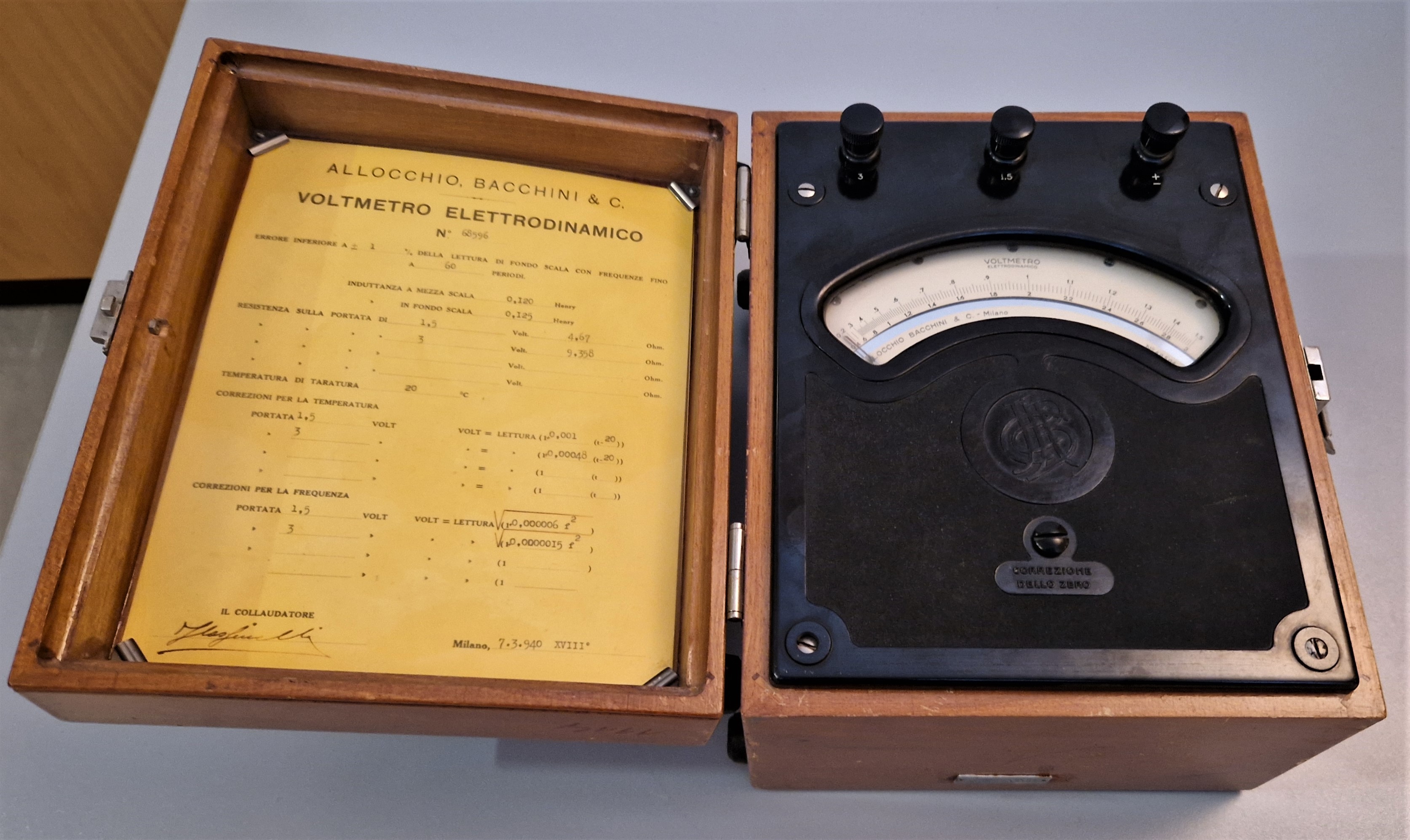 Merilna dosega voltmetra, ki ju dosežemo z različnima preduporoma, sta 1,5 V in 3 V. Upornosti voltmetra sta 4,67 Ω in 9,36 Ω, induktivnost na sredini skale 120 mH, razred točnosti r = 1, skala ni linearna. Naravnavanje ničlišča je z vijakom, lega pa je ležeča. Instrument lahko uporabljamo tudi pri drugi frekvenci, upoštevati pa moramo priloženo korekcijsko enačbo. Podobno velja za temperaturo.