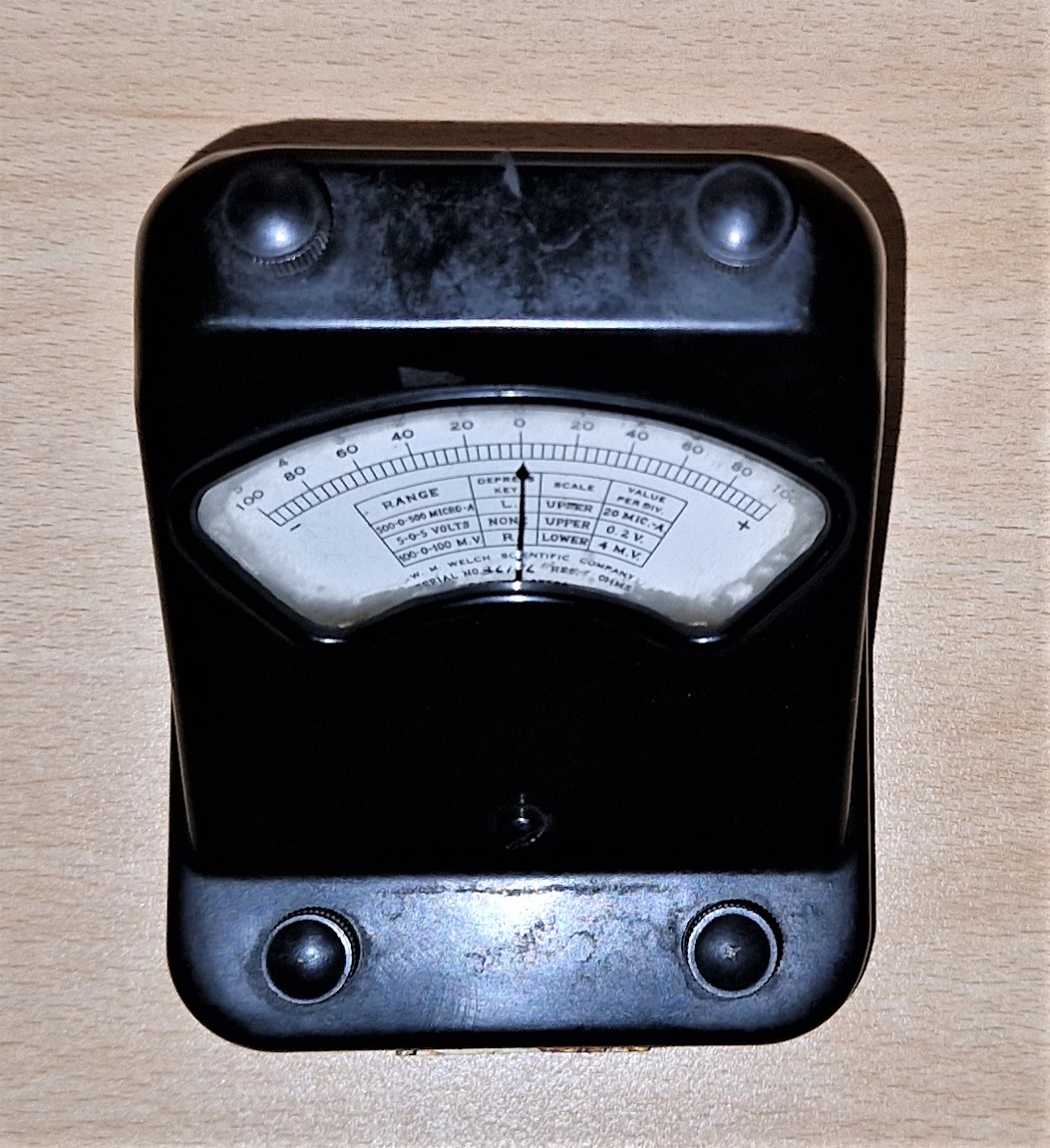 Galvanometer je zasnovan na instrumentu s trajnim magnetom in tračno vpeto vrtljivo tuljavico. Uporablja se za merjenje napetosti in merjenje toka, zato ima tem namenom prilagojeni skali. Kot voltmeter ima osnovno območje ±100 mV, razširjeno s pomočjo predupora pa ±5 V. Napetost v prvem primeru odčitavamo na skali z oznako –100...0...+100, v drugem pa na skali z oznako –5...0...+5. Kot ampermeter ima merilno območje ±500 µA, za odčitavanje pa uporabljamo že omenjeno skalo –5...0...+5. Posamezna merilna območja izbiramo s pomočjo dveh tipk, ki sta vgrajeni na zgornjem delu ohišja instrumenta. Katero moramo pritisniti, je prikazano v tabeli na številčnici instrumenta.